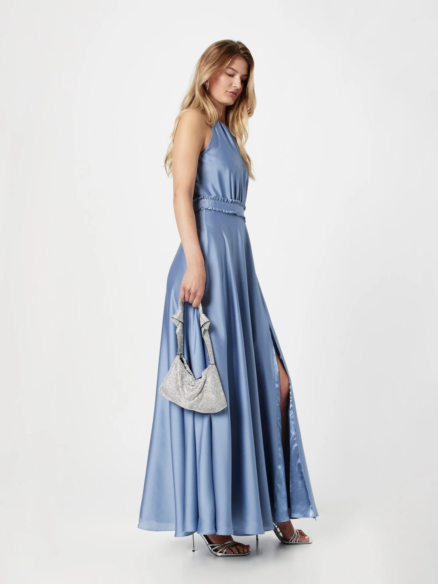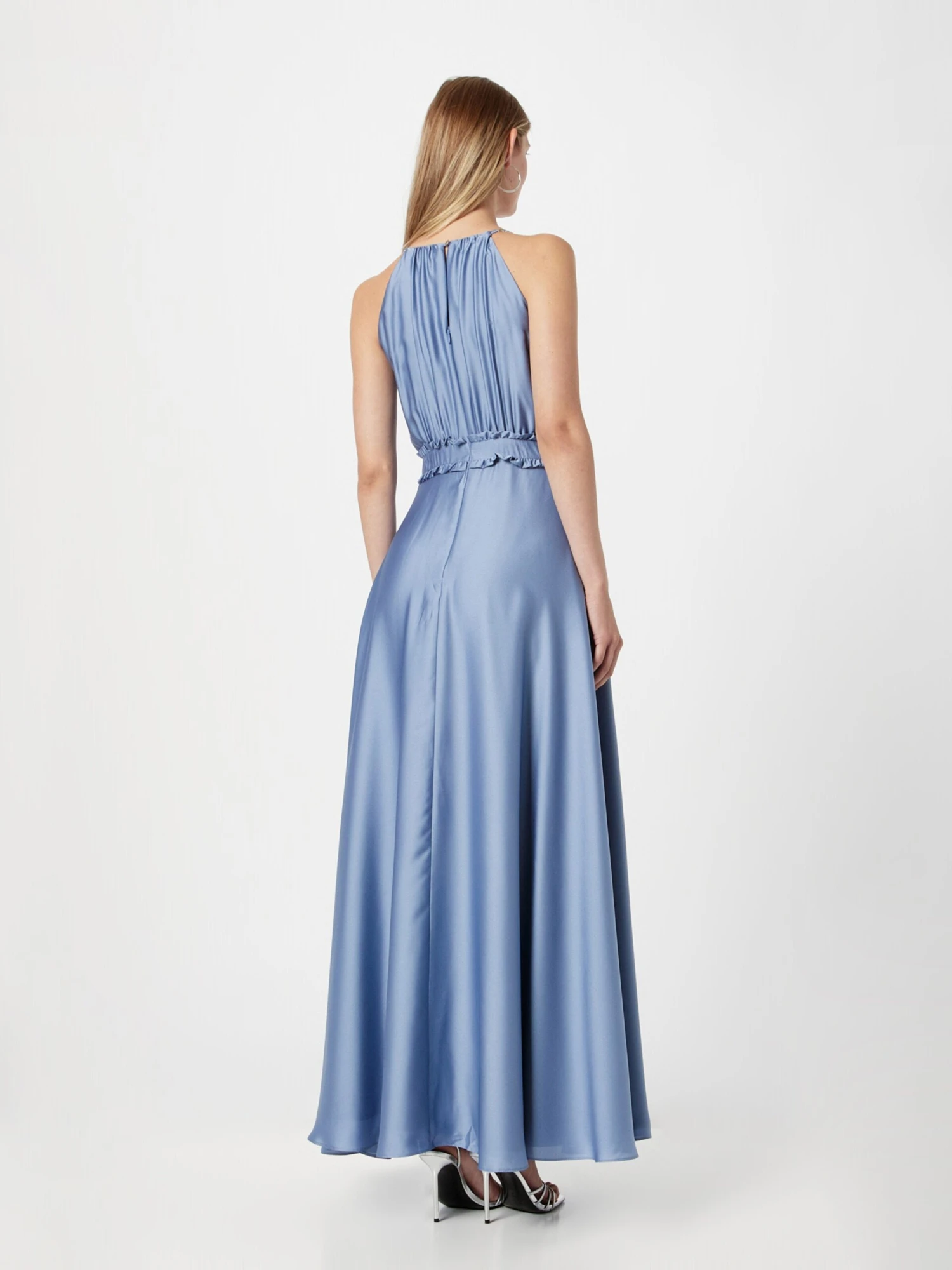 EffenSatijnHaltermodelRonde halsCut-outsRuchesGedrapeerdGevoerde zoom/randAmerikaanse schouderFlareBeenopeningKeyholesluitingRug ritsGlanzendGladde stofKnoopsluiting
