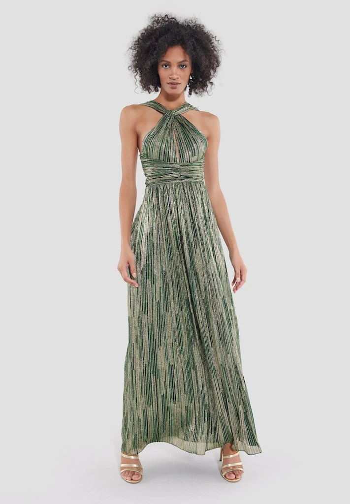 Een geweldige jurk met sparkles! Deze maxi jurk is mouwloos en heeft een open rug/taille en een brede tailleband waardoor je taille extra goed benadrukt wordt.