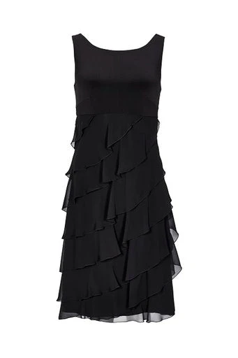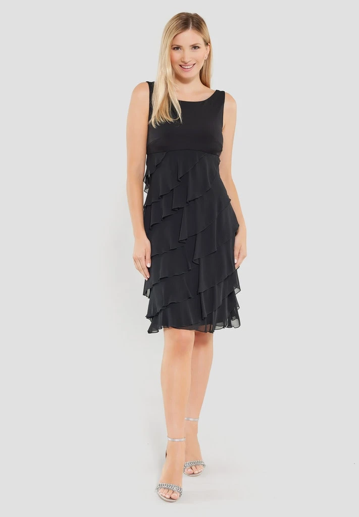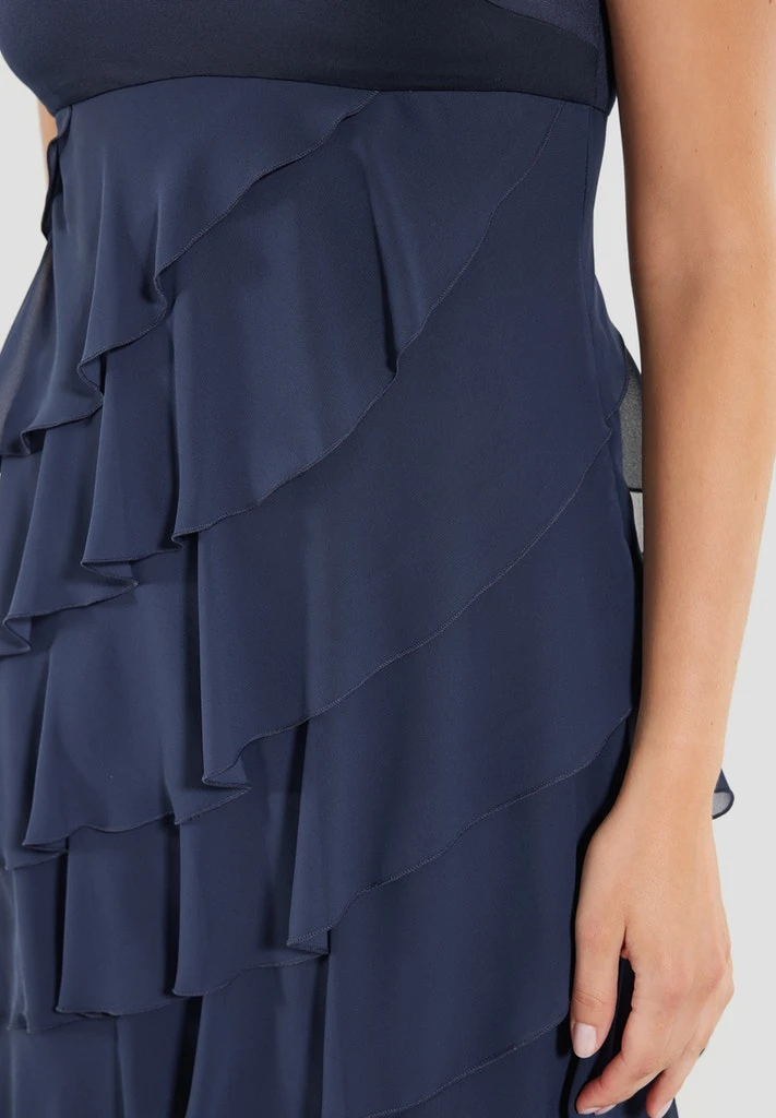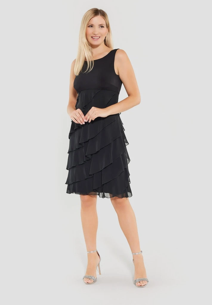 Cocktail jurk met prachtige lagen die schuin lopen over het lijf waardoor dit een mooi zweirig effect geeft. De jurk heeft een ronde hals, is mouwloos en heeft een ritssluiting aan de zijkant. Aan de achterkant heeft de jurk een v-hals opening.