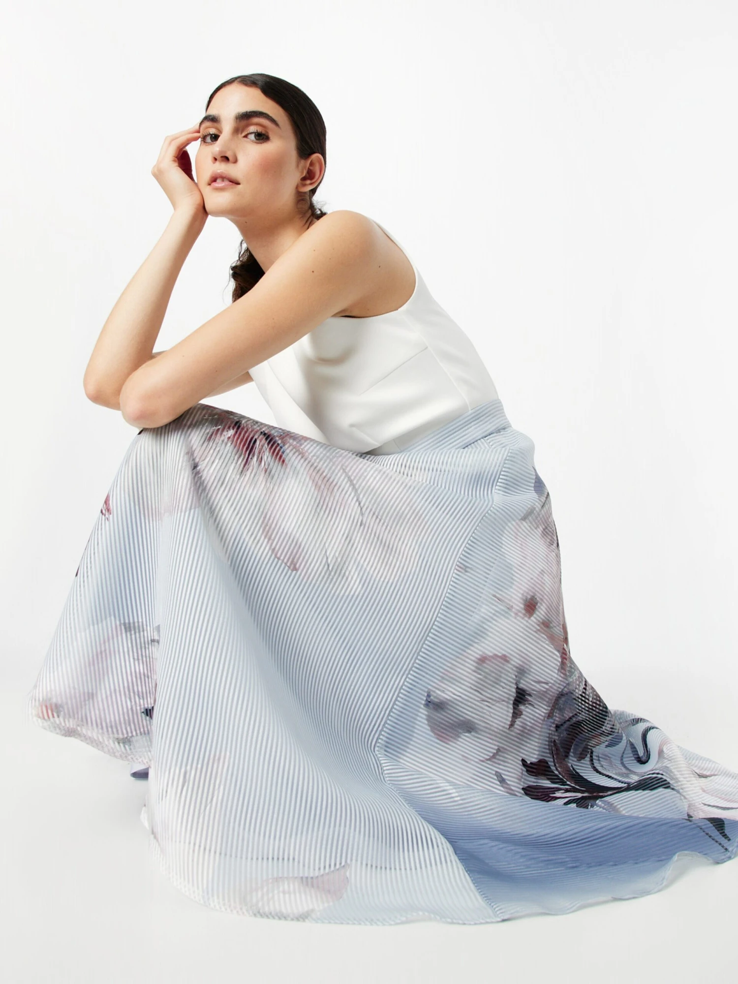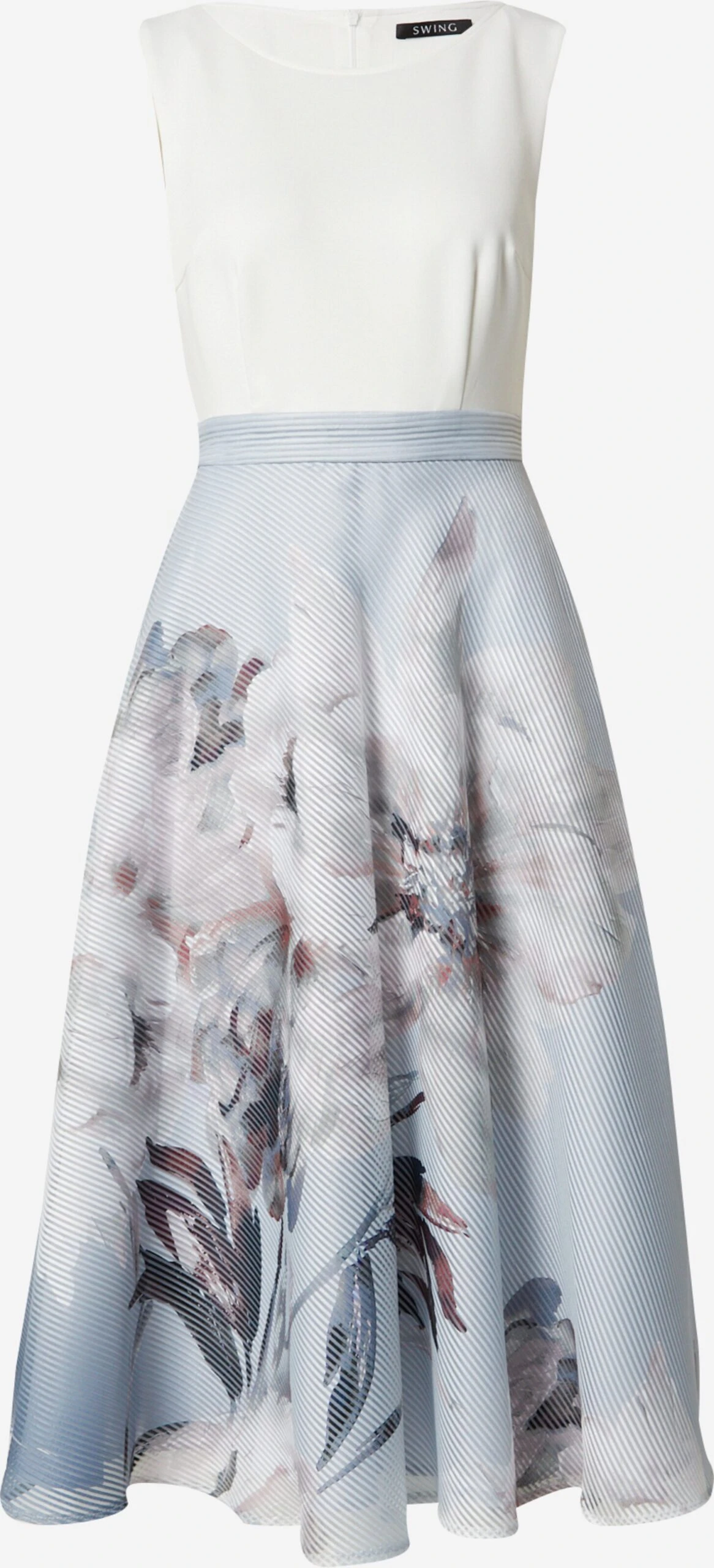 BloemenprintBrede bandjesRonde halsGedrapeerdFlareRug ritsMateriaal mixGladde stofBuigzame gripRitssluiting