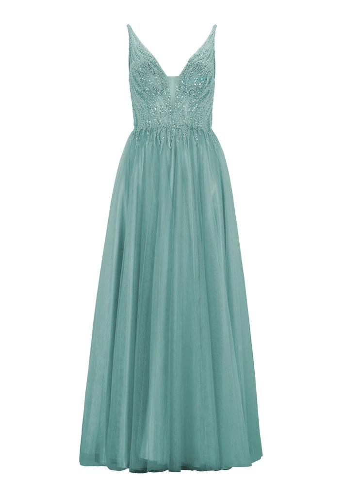 Gala jurk met prachige steentjes en pailletten. De rok van de jurk heeft een mooie tulle laag over een satijnen onderrok.