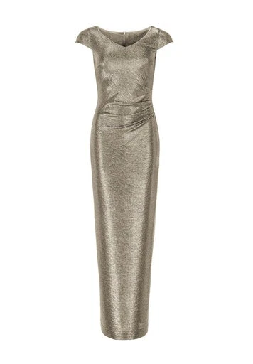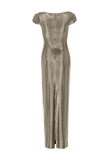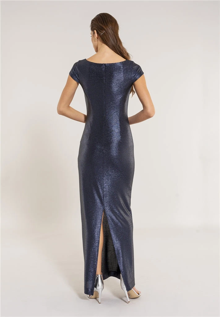 Prachtige shiny maxi jurk die aangesloten zit op het figuur. De jurk heeft een v-hals en split op het achterpand. De jurk rekt mee omdat er elastiene in de stof zit dus deze zit lekker.